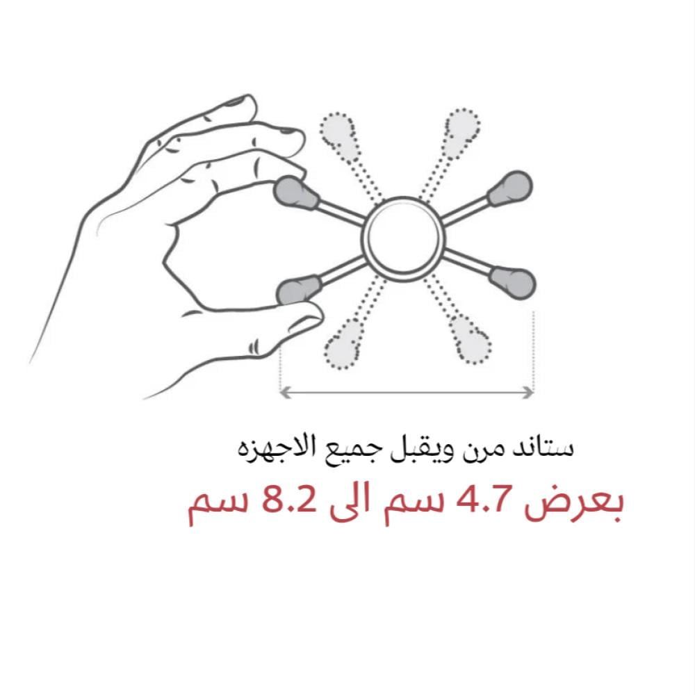 - ستاند الجوال مرن ويقبل جميع الجوالات الكبيره اللى يتراوح عرضها بين 4.7 سم الى 8.2 سم وسمكها اقل من 2.22 سم.